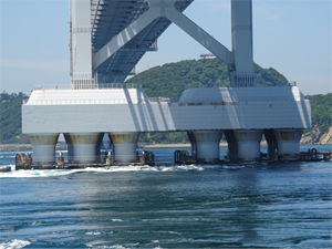 うず潮で名高い鳴門海峡にある大鳴門橋の塔基礎は、潮流を阻害しないよう、多柱基礎を採用しています。多柱基礎は、鋼管と内部の鉄筋コンクリートで構成されており、鋼管を腐食から守るための防食工事を行っています。