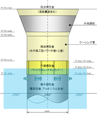 防食方法は、場所ごとに適切な方法を採用しており、飛沫帯部は水中施行型エポキシ樹脂+塗装、干満帯部はペトロラタム(石油ワックスの一種)及びそれを保護する耐食性に優れたチタンカバー、海中部は電気防食を採用しています。