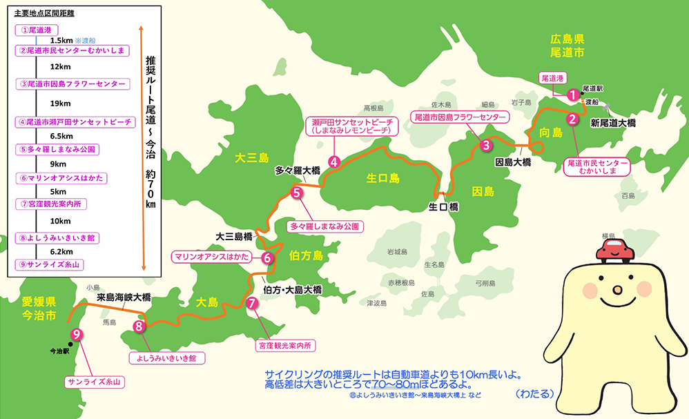- 自転車と歩行者が混在して通行する橋梁区間(生口橋、多々羅大橋、来島海峡大橋)については、歩行者優先で通行してください。