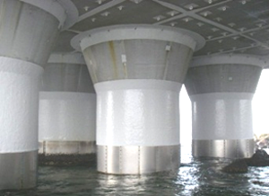 We use different corrosion prevention methods that are appropriate for each area: underwater epoxy resin and paint are adopted for areas subjected to spray, petrolatum (a kind of petroleum wax) and a titanium cover with superior corrosion resistance are adopted in areas subject to tides, and cathodic protection is adopted in underwater areas.