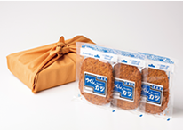ピリッと香ばしいカレー味のフィッシュカツは、おやつやサンドイッチなどアレンジも楽しめる。1枚ずつレンジアップできる個別包装で、黄金色の風呂敷に包んでお届けします。