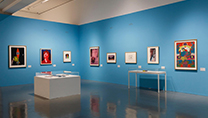 展覧会ごとに展示方法を工夫。「画家の肖像」(2018年5月26日~8月26日)では、ブルーの壁面にグラフィックデザイナー時代の作品、白の壁面に画家宣言以降の作品が展示されている
