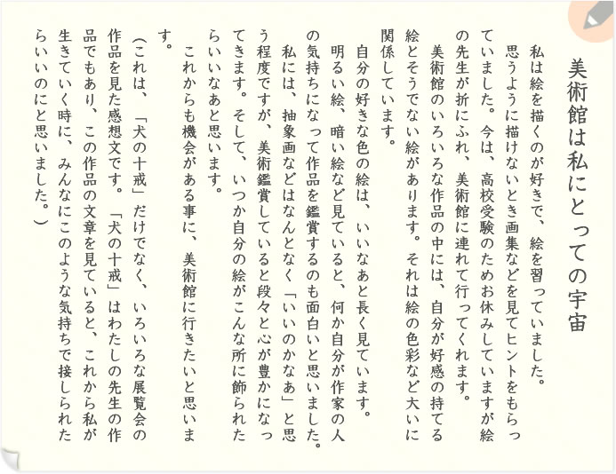 「犬の十戒」をはじめとする様々な作品との出会いを通して得た心情が、素直な表現で記されています。文章から、自分がどのような絵をなぜ好むのかを考えたり、作品を鑑賞する方法について思いをいたらせていることもわかります。これからも美術館に行って、一つひとつの作品をじっくりと鑑賞することを心がけましょう。