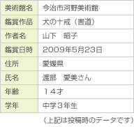 絵画や彫刻だけでなく、書や工芸品、そして、デザインや写真の作品など、いろいろな作品を展示している美術館が少なくありません。渡部さんが素敵だなと思って感想文を書くきっかけになった作品も、今治市河野美術館に展示されていた書の作品でしたね。これからも、ジャンルにこだわらずに、いろいろな作品を見て感想を書いてください。
