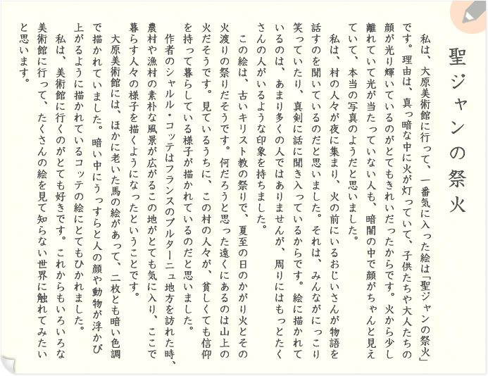 まるで清涼な空気を呼吸するかのように、コッテの作品に描かれた村の魅力を心の中に吸い込んでから書いた、素晴らしい文章ですね。そして、ブルタ-ニュ地方の農村や漁村の素朴な風景に魅せられた画家の気持ちまでよく理解しています。もしも画家が生きていたら、あなたのこの文章に感激したことでしょう。亜香さんはもう気づいていると思いますが、美術作品は、アーティストのものの見かた、感じ方、そして考え方を時間や空間を超えて伝えてくれるタイムカプセルです。