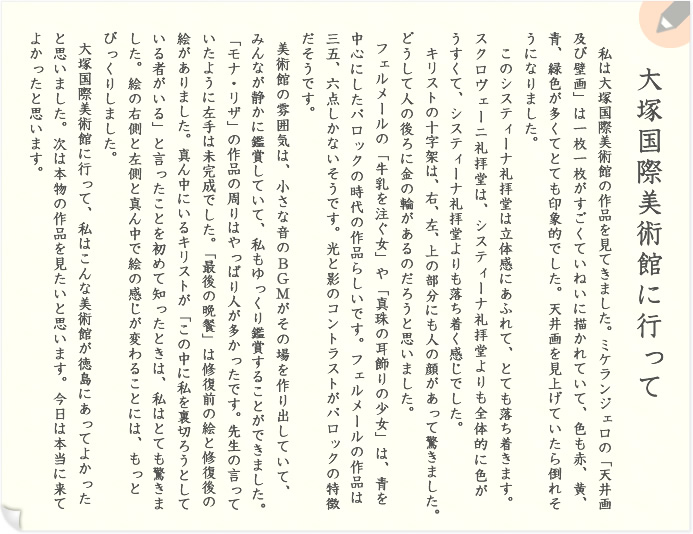 礼拝堂を見上げて鑑賞したり、ダ・ヴィンチやフェルメールといった有名な作家の作品と向き合い、素敵な美術館体験をされまいしたね。作品に描かれた場所や人々の服装やしぐさ、持ち物にもそれぞれに意味が込められています。謎もいっぱいありますよ!ぜひ調べてみてください。