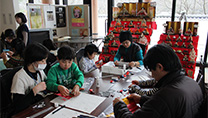 当日の美術館では、『縁起物』をテーマとした作品を中心とした展覧会が開催中で、ワークショップでは、展覧会の内容に関連し、子ども達に親しみのある縁起物『おひなさま』を題材に、親子で協力して「とびだす『おひなさまカード』を作ろう」にチャレンジしていただき、手作りで製作する楽しさを体感していただきました。