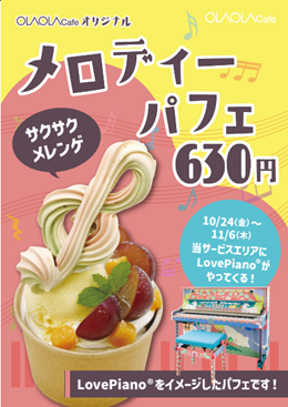 1階「OLAOLA Café」では、ピアノをイメージした期間限定スイーツ「メロディーパフェ」を販売中!ぜひ一度お召し上がりください♪