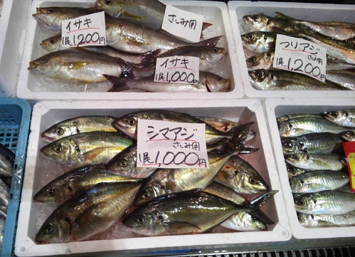 最後に、もう一度「どーや市場」を覗きました。朝にくらべ、魚が大半無くなっていて、空箱が目立っていましたが、残った商品は、超格安になっていました。