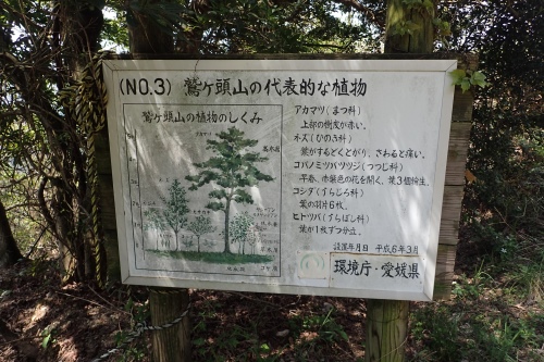 登山口付近には、大三島自然研究路の案内看板がありました。鷲ヶ頭山まで赤い経路(左側から右側へ)を安神山経由で辿ります。延長2.5km、登りに1時間30分かかるとあります。それにしても「大三島の自然と親しいお友達になっていただくために設けられたものです。」とは、良いですね。